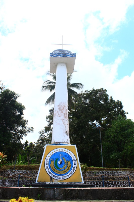 (Tugu yang kini berdiri di puncak bukit menjadi monumen iman menandai tempat pertama Van Balen berkhotbah dan mengajarkan Firman Tuhan di Windesi.)